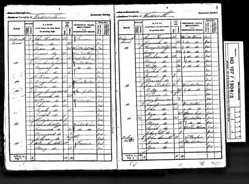 Thomas Sutcliffe, 62, hand loom weaver wool and farmer; Betty, 56, wife; Mary, 35, hand loom weaver worsted; Grace, 29, power weaver cotton; Thomas, 27, hand loom weaver worsted; Henry, 22, shoemaker; Sarah Ann, 18, power loom weaver cotton; Betty, 15, frame tenter cotton; Jane,10, scholar. All b. Wadsworth. - Wadsworth Lanes: